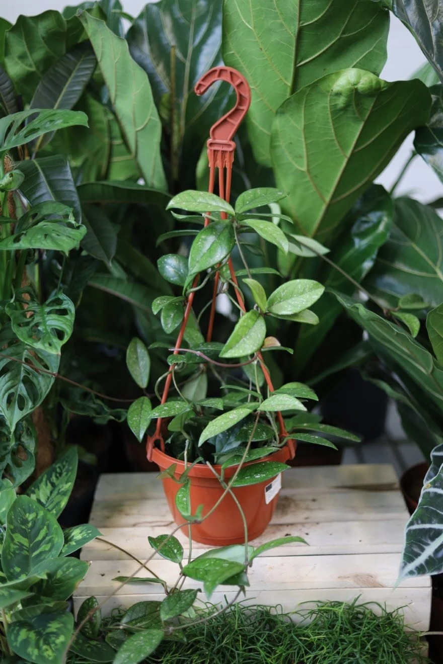 Hoya carnosa ‘Splash’ to efektowna roślina pnąca o mięsistych, błyszczących liściach ozdobionych srebrzystymi plamkami, które tworzą charakterystyczny efekt „splash”. Dzięki pnącemu pokrojowi doskonale prezentuje się w wiszących donicach i na półkach. Jest ceniona nie tylko za dekoracyjne liście, ale również za możliwość kwitnienia- w sprzyjających warunkach wytwarza pachnące, gwiazdkowate kwiaty zebrane w baldachimy.